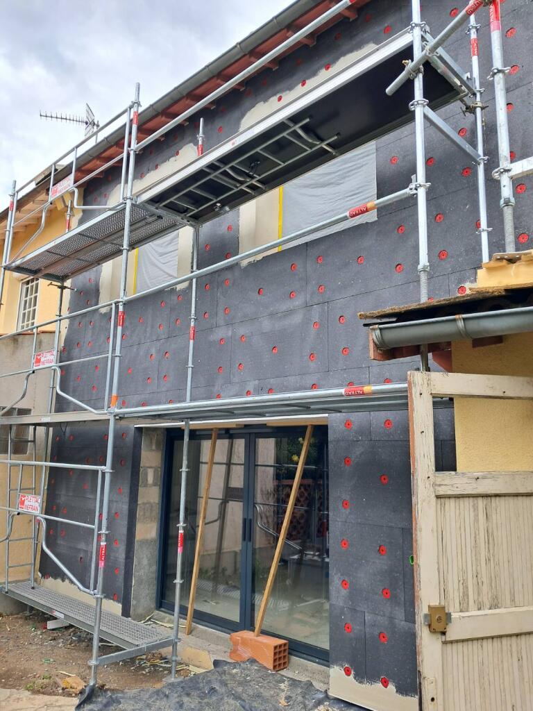 Nous avons récemment réalisé une isolation thermique par l’extérieur (ITE) sur une villa située à Cugnaux (31), dans le but d’améliorer les performances énergétiques de l’habitation tout en lui conférant une esthétique moderne. Pour cette intervention, des panneaux en polystyrène expansé graphite TH32 de 120 mm d’épaisseur ont été posés, offrant une excellente résistance thermique. Ces panneaux ont été minutieusement installés sur l’ensemble des façades, après une préparation rigoureuse des supports et la correction des irrégularités. Pour finaliser cette réalisation, un enduit mince (RPE) teinté a été appliqué, apportant une finition durable et harmonieuse, en parfaite adéquation avec le style architectural de la villa. Cette isolation a permis de réduire considérablement les déperditions thermiques tout en améliorant le confort intérieur. Nous sommes fiers de vous présenter cette belle réalisation